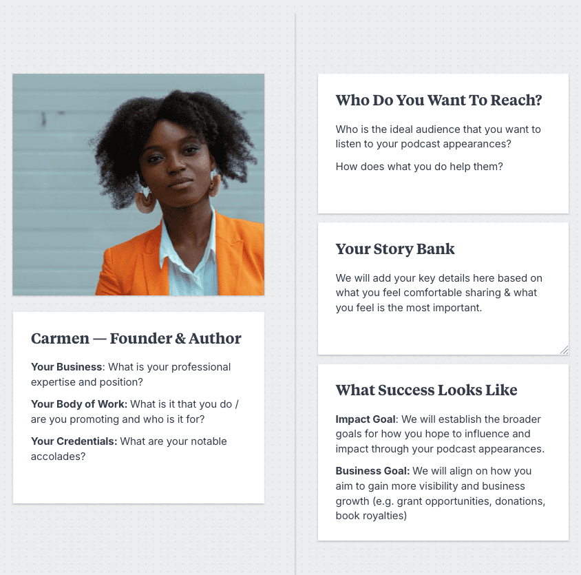 A prep call & practice interview session with real-time feedback you can implement to level up your next guest appearance.